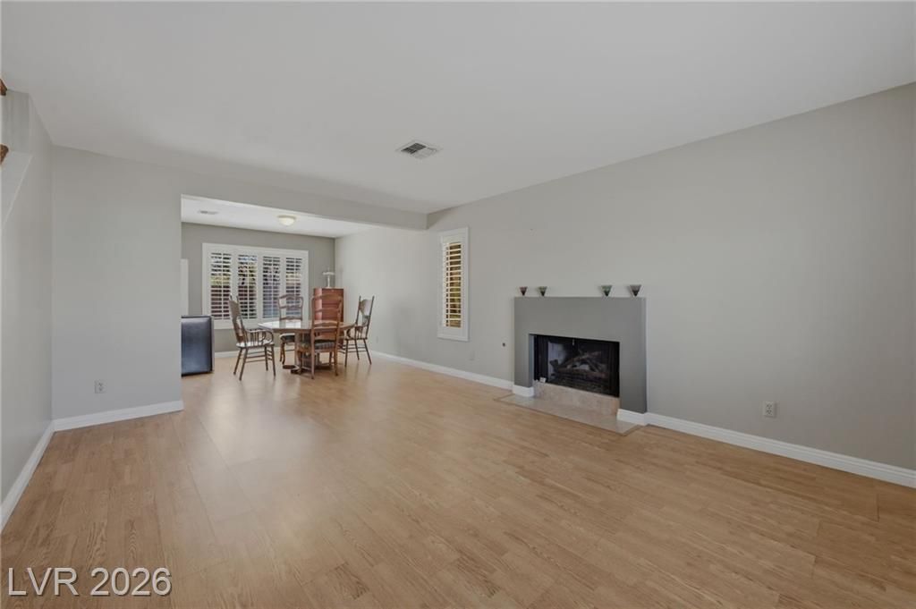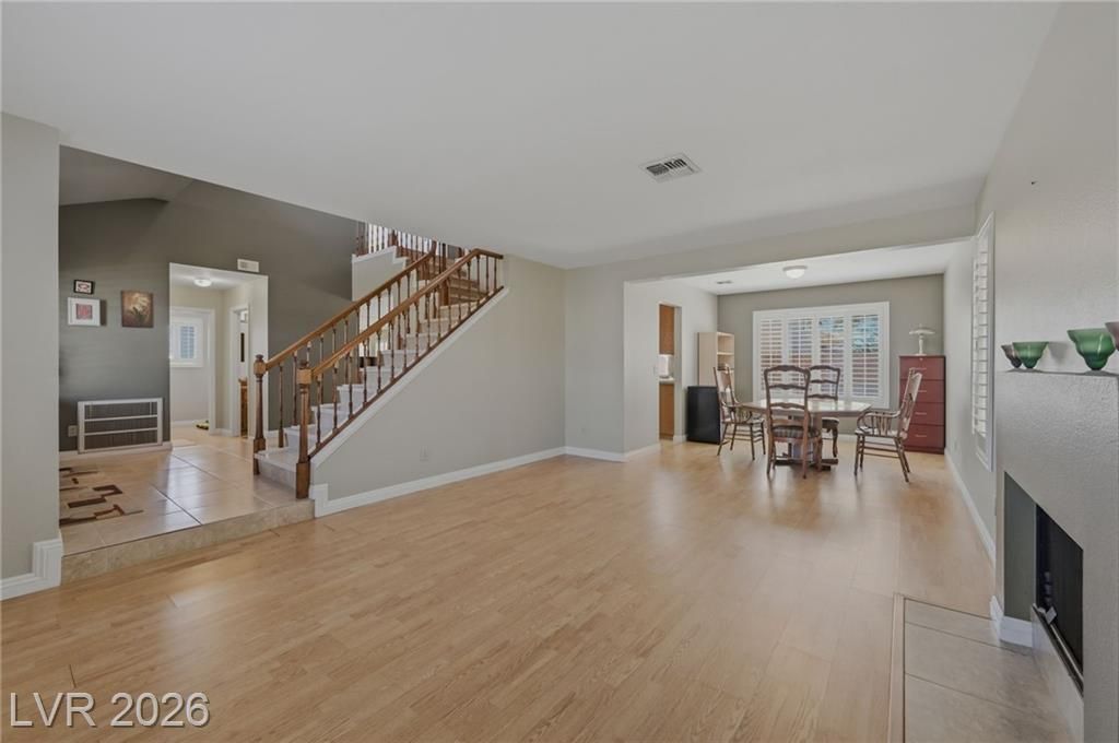 Beautiful two-story home in the highly desirable Lakes master-planned community, ideally located on a quiet cul-de-sac. Charming curb appeal. 3 beds, 2.5 baths, 1,883 sq ft on a 6,098 sq ft lot with a bright, open floor plan. Formal living room with a quaint fireplace. Kitchen features granite countertops, breakfast bar, tile flooring, and ample cabinet space. Adjacent family room offers a mirrored accent wall. Living and family rooms feature hardwood flooring throughout. Downstairs laundry room with built-in cabinets. A marble staircase with a wood banister leads upstairs. Primary suite includes a walk-in closet, sitting/retreat area, and bath with jetted tub and shower. All bedrooms feature hardwood flooring. Plantation shutters throughout. Attached 2-car garage with interior access. Large backyard with covered patio and new A/C unit. Conveniently located near schools, parks, shopping, dining, and Downtown Summerlin.
